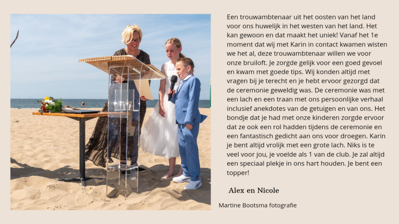 Ik ben Karin, de trouwambtenaar met een hart voor verhalen die verbinden en momenten die blijven hangen.